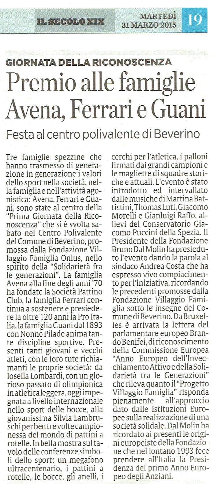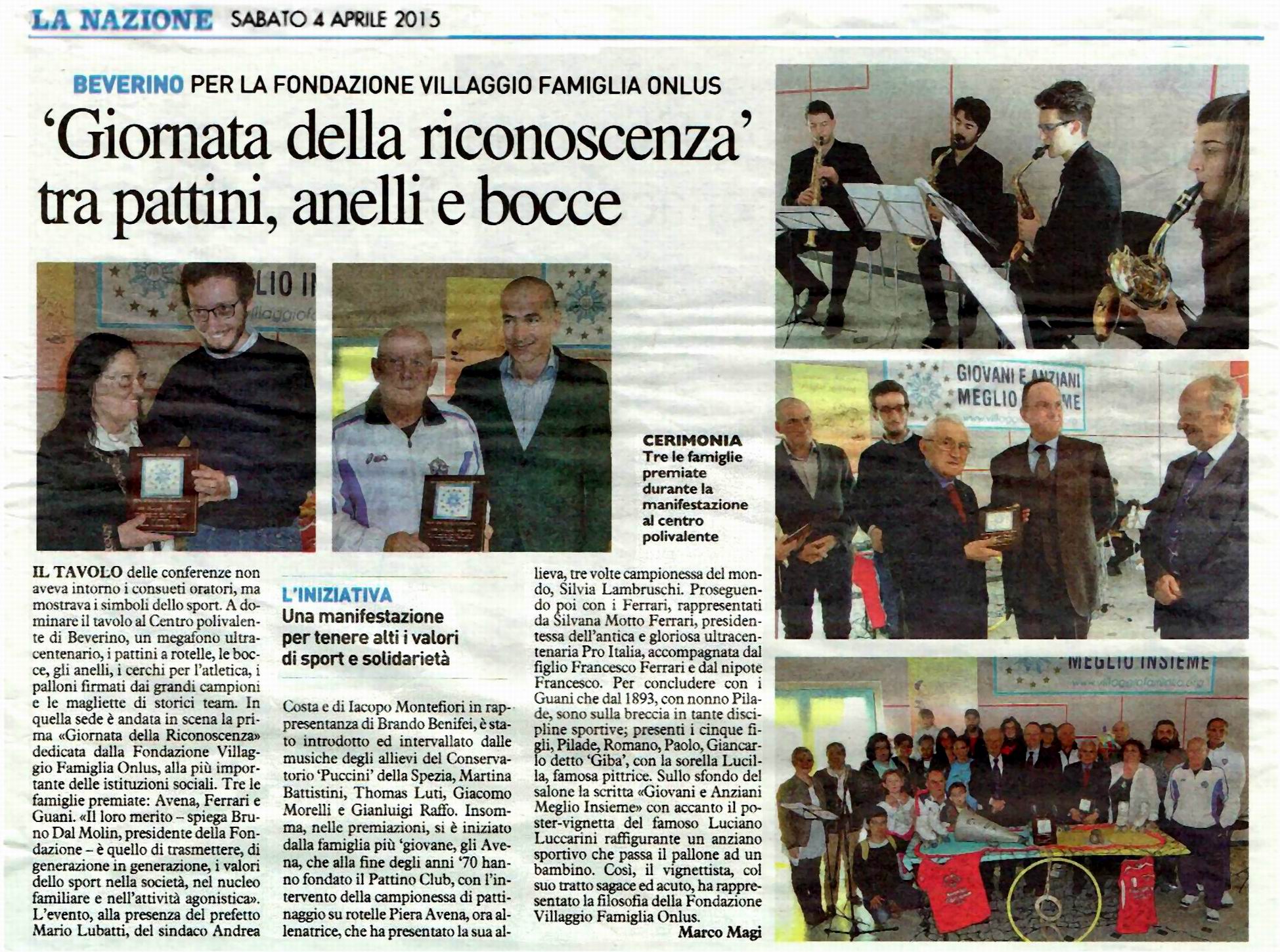 Sabato 28 marzo 2015 presso il salone del Centro Polivalente del Comune di Beverino si è svolta la “Prima Giornata della Riconoscenza” alle famiglie, secondo lo spirito della Fondazione Villaggio Famiglia Onlus fondato sulla solidarietà fra le generazioni.