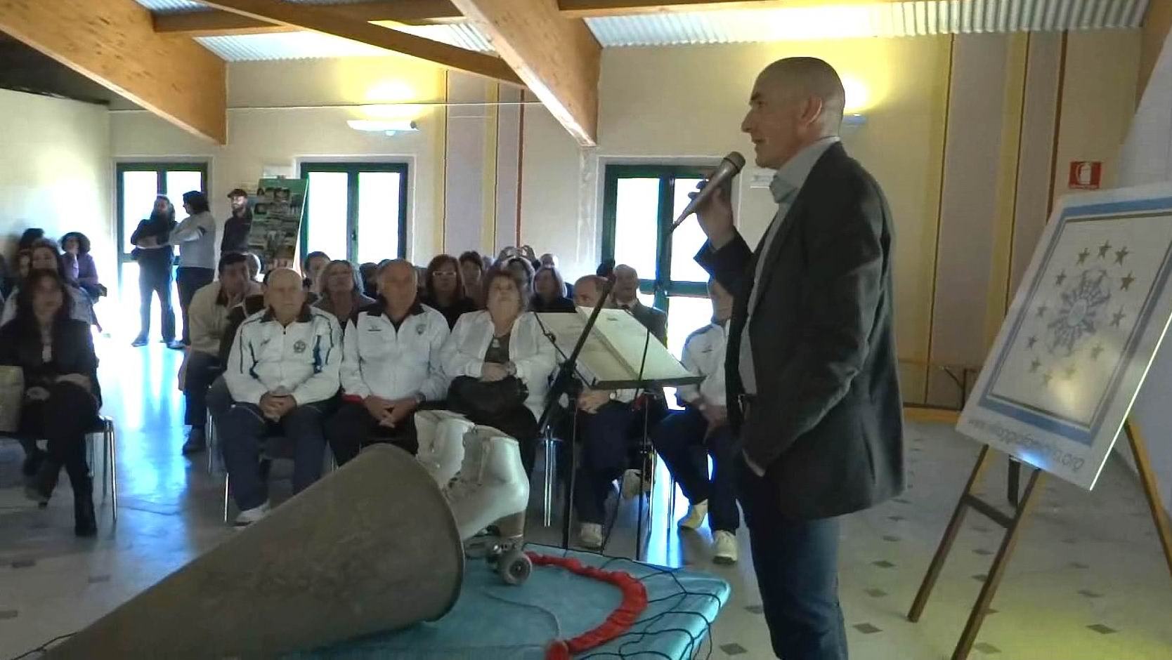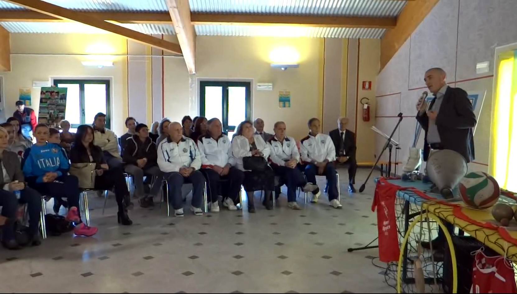 Nella scenografia, veramente suggestiva e originale, il tavolo delle conferenze era costituito dai simboli dello sport: vi dominavano un megafono ultracentenario, i pattini a rotelle, le bocce, gli anelli, i cerchi per l’atletica, i palloni firmati dai grandi campioni e le magliette di squadre storiche e odierne.