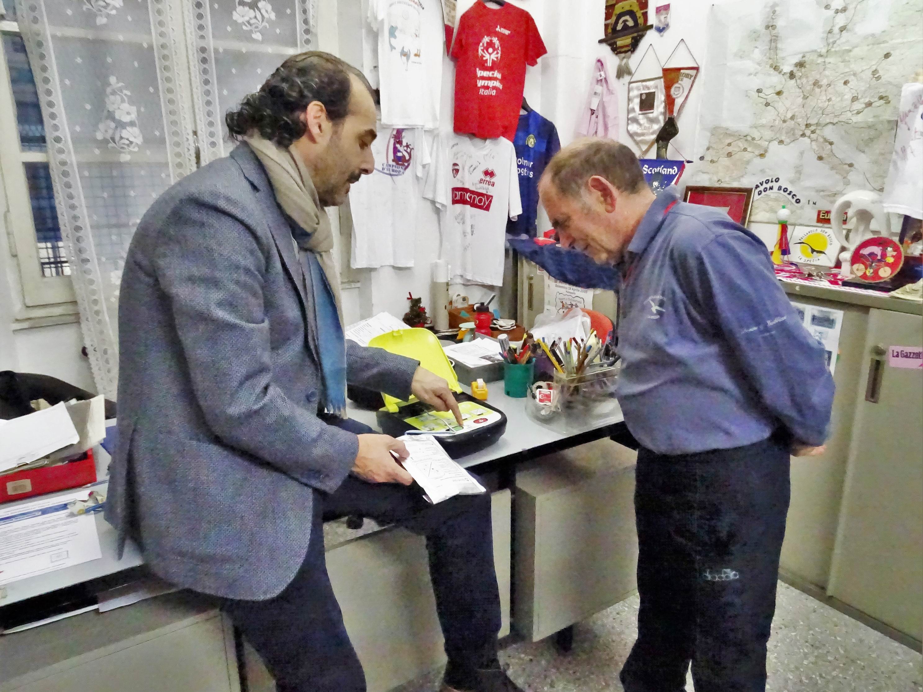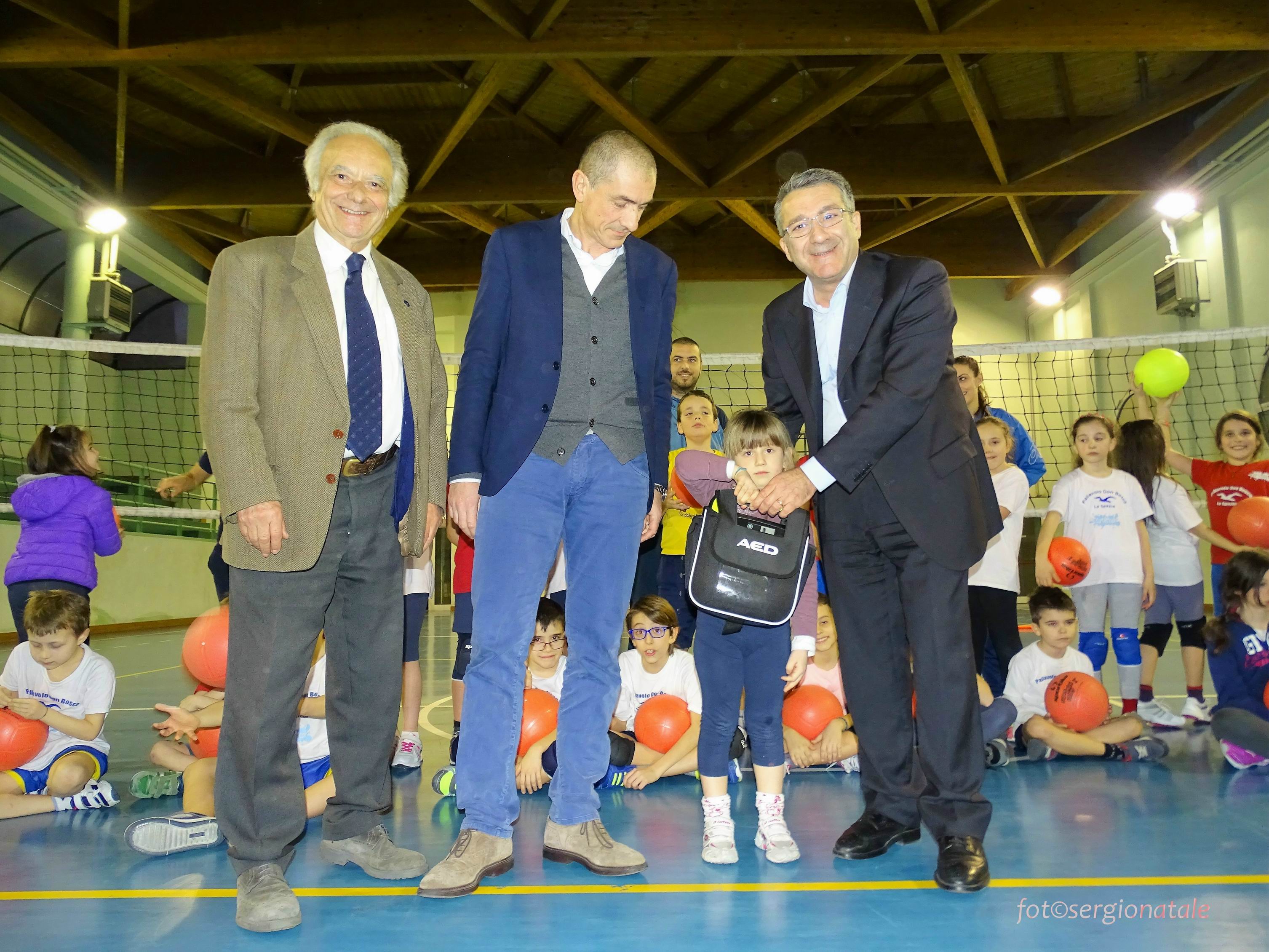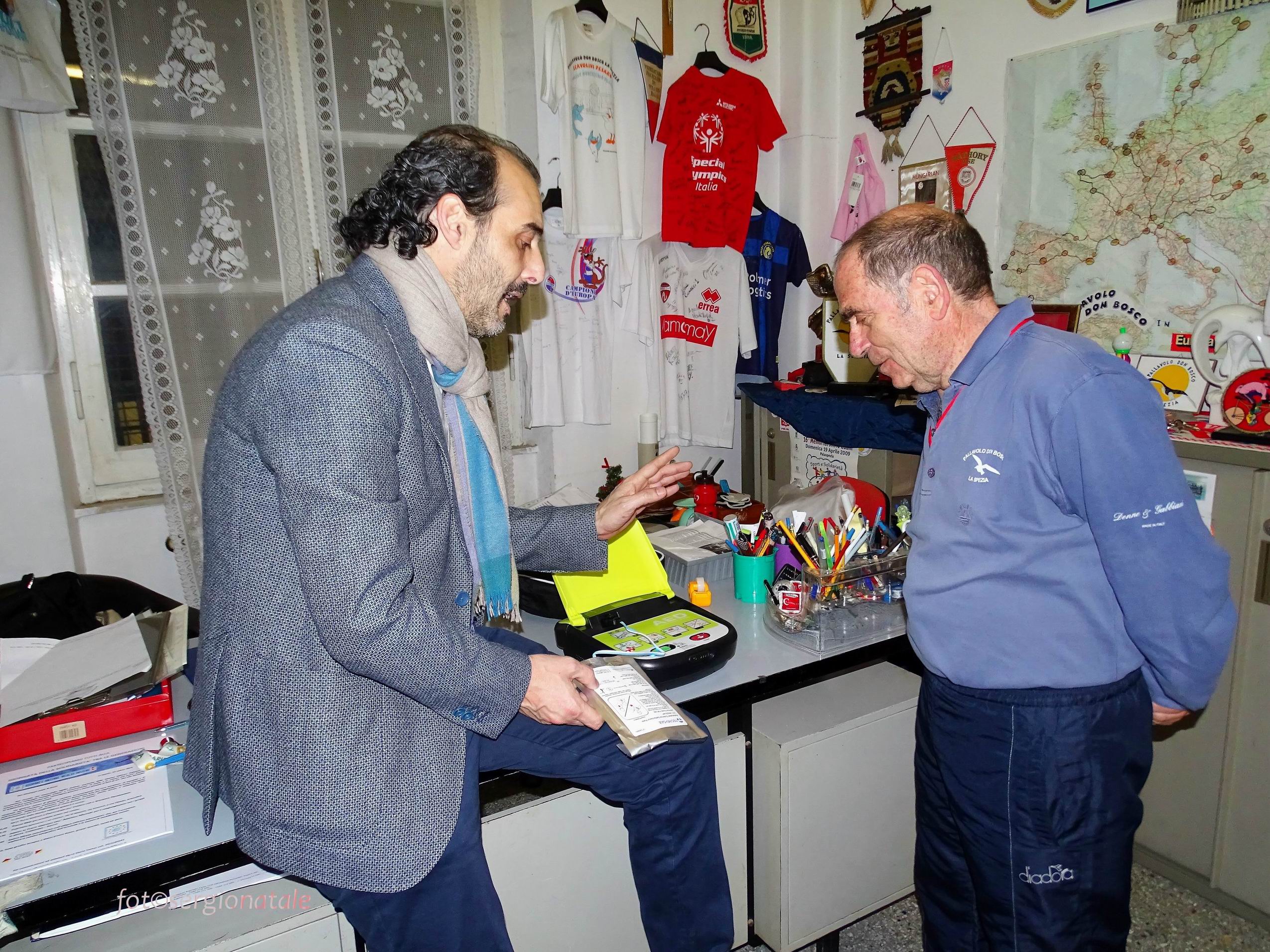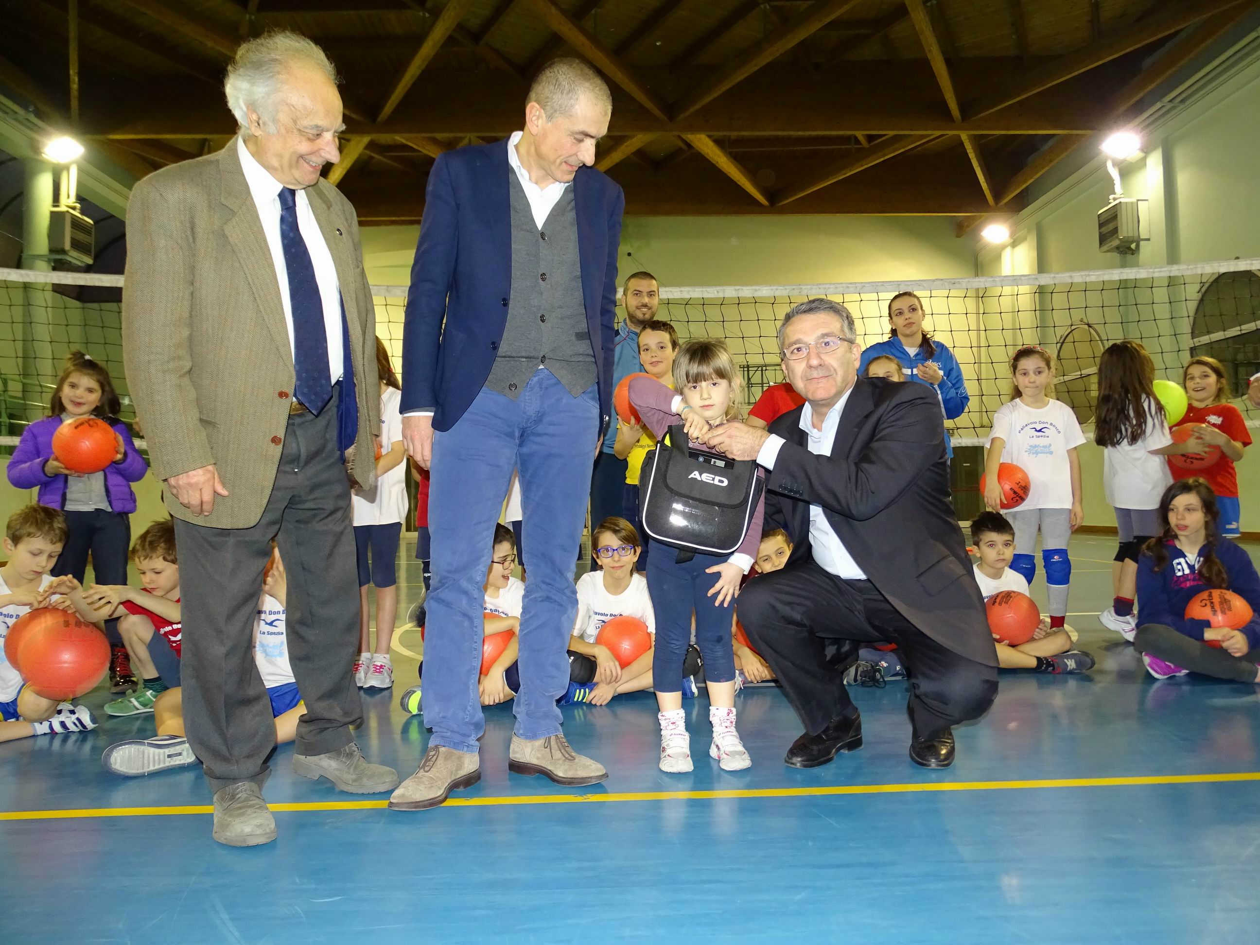 Un importante traguardo per la sicurezza nello sport dilettantistico spezzino quello di oggi pomeriggio, con la consegna del defibrillatore a Giancarlo Guani, Presidente della Società Sportiva Dilettantistica Pallavolo Don Bosco e nostro rappresentante per la trasmissione dei valori del gioco nelle scuole. L’importante strumento “salvavita” è stato consegnato dal Vice Presidente della BCC – Banca di Credito Cooperativo Versilia Lunigiana e Garfagnana, Giuseppe Menchelli, insieme al Capo Area Territoriale dell’Istituto di Credito Giovanni Cesarano, in una breve ma vivace “cerimonia” che ha visto protagonisti i giovani allievi del gruppo sportivo nel corso dell’allenamento pomeridiano. Importante e significativa la presenza del consigliere regionale Andrea Costa, promotore di questa importante iniziativa e grande amico della Fondazione Villaggio Famiglia e della Pallavolo Don Bosco di Giancarlo Guani, che è giunto appositamente da Genova, dov’è fortemente impegnato nei suoi incarichi istituzionali in particolare quale Presidente della IV commissione. Non potevano mancare il nostro Presidente della Fondazione Villaggio Famiglia Bruno Dal Molin e l’Ammiraglio Andrea Toscano, quest’ultimo Presidente dell’Associazione il Golfo e la Cultura del Mare nostro partner nella imminente iniziativa del 19 marzo prossimo presso l’Arsenale Militare e per le vie della città. Giorgio Scotto, consigliere della Fondazione e Romano Guani tra gli altri entusiasti amici che sono intervenuti alla cerimonia. Il titolare del Centro Medico Lunense Ernesto Balisciano, che ha fornito l’attrezzatura e ne curerà la manutenzione, si è poi intrattenuto presso la sede della Pallavolo Don Bosco per illustrare a Giancarlo Guani il funzionamento del defibrillatore.