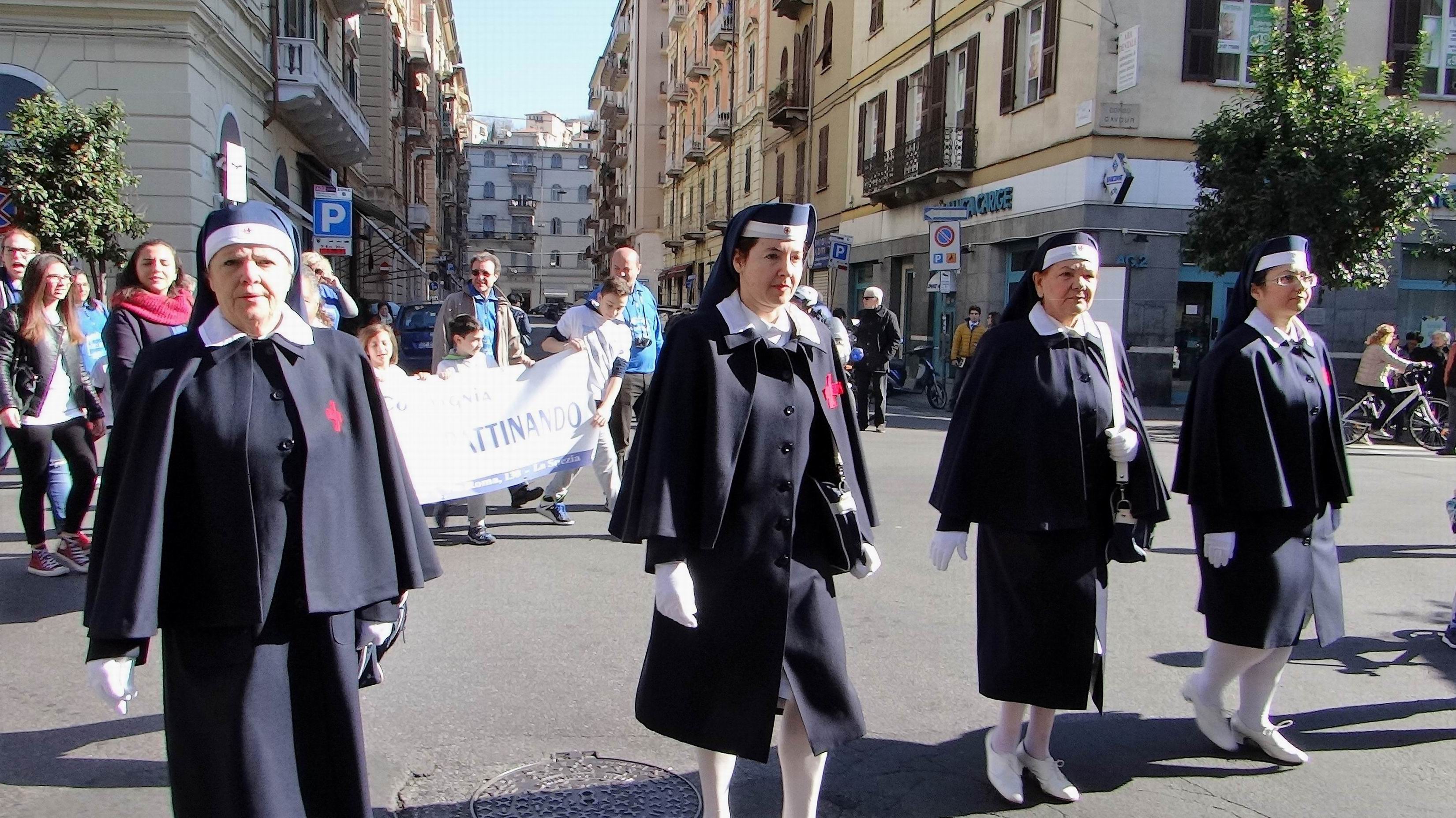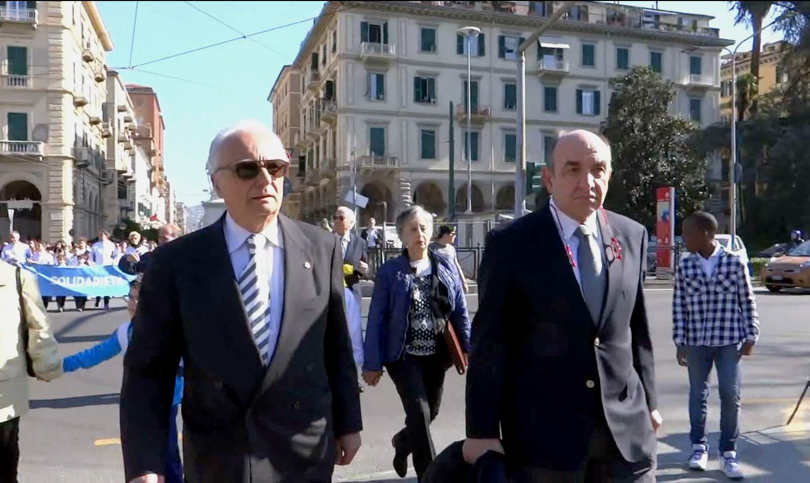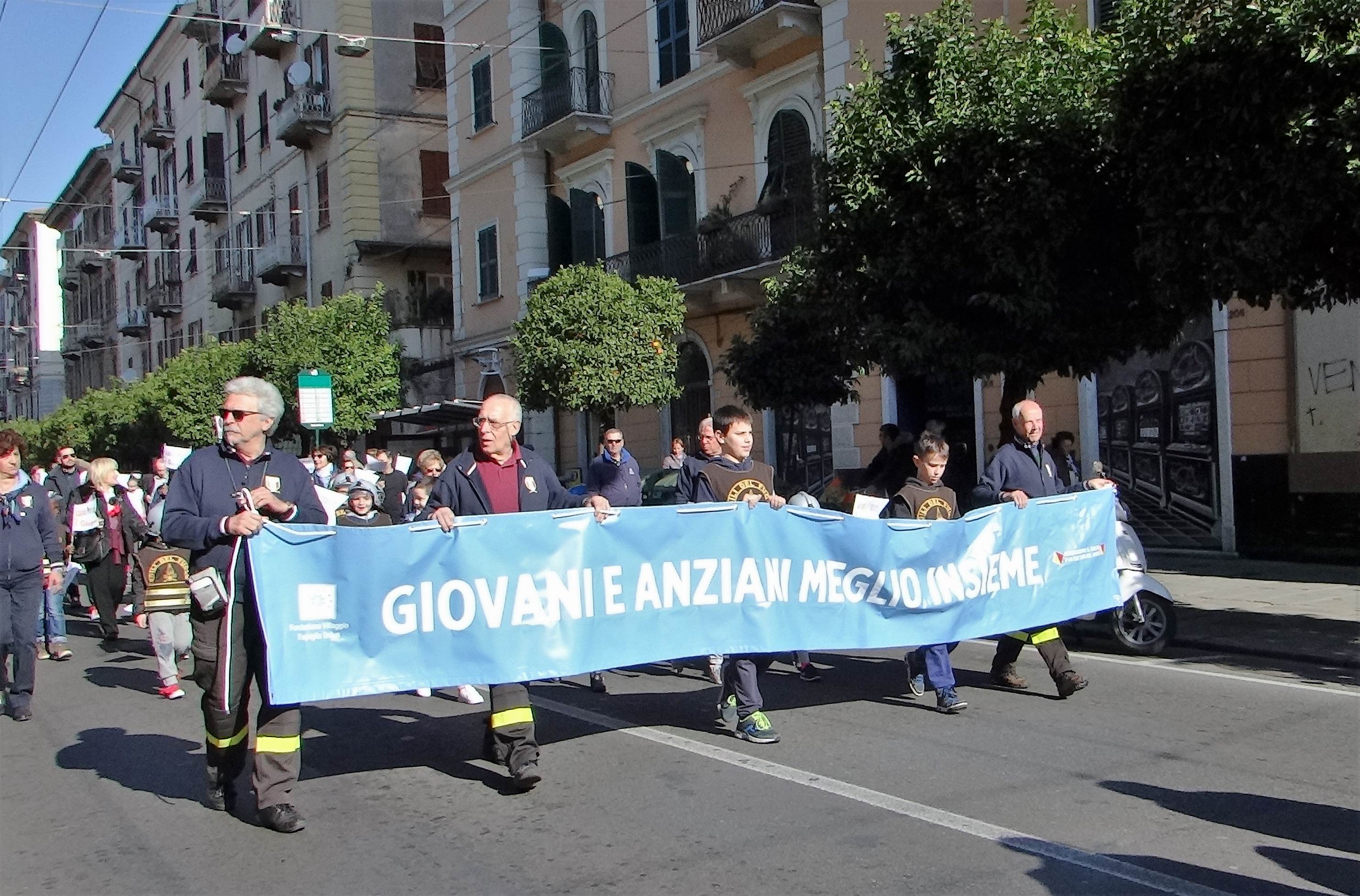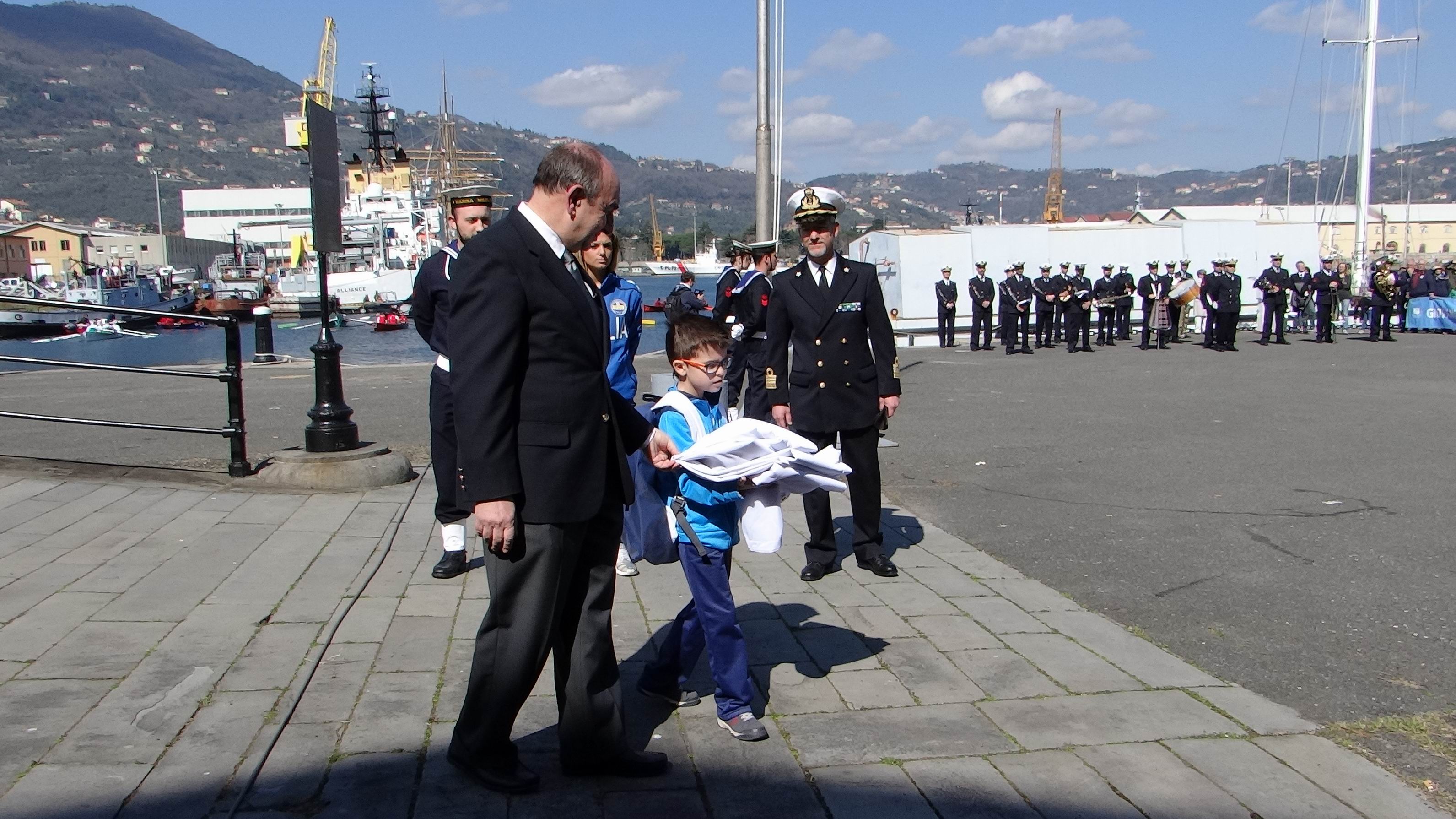 Subito dopo seguivano i piccoli Mattia e Vittoria, tenuti per mano dalle nonne Elsa e Maria Pia, con sulle spalle gli zainetti contenenti l’uno la bandiera della Fondazione e l’altro i fiori destinati al lancio in mare, e poi il corteo con gli striscioni della solidarietà tra le generazioni ed i vari gruppi intervenuti, mentre le imbarcazioni storiche del Palio del Golfo, con gli equipaggi di ieri e di oggi, scortati dalla Polizia Marittima, giungevano al Ponte Girevole colorandolo dei loro colori caratteristici schierandosi nello specchio d’acqua antistante.