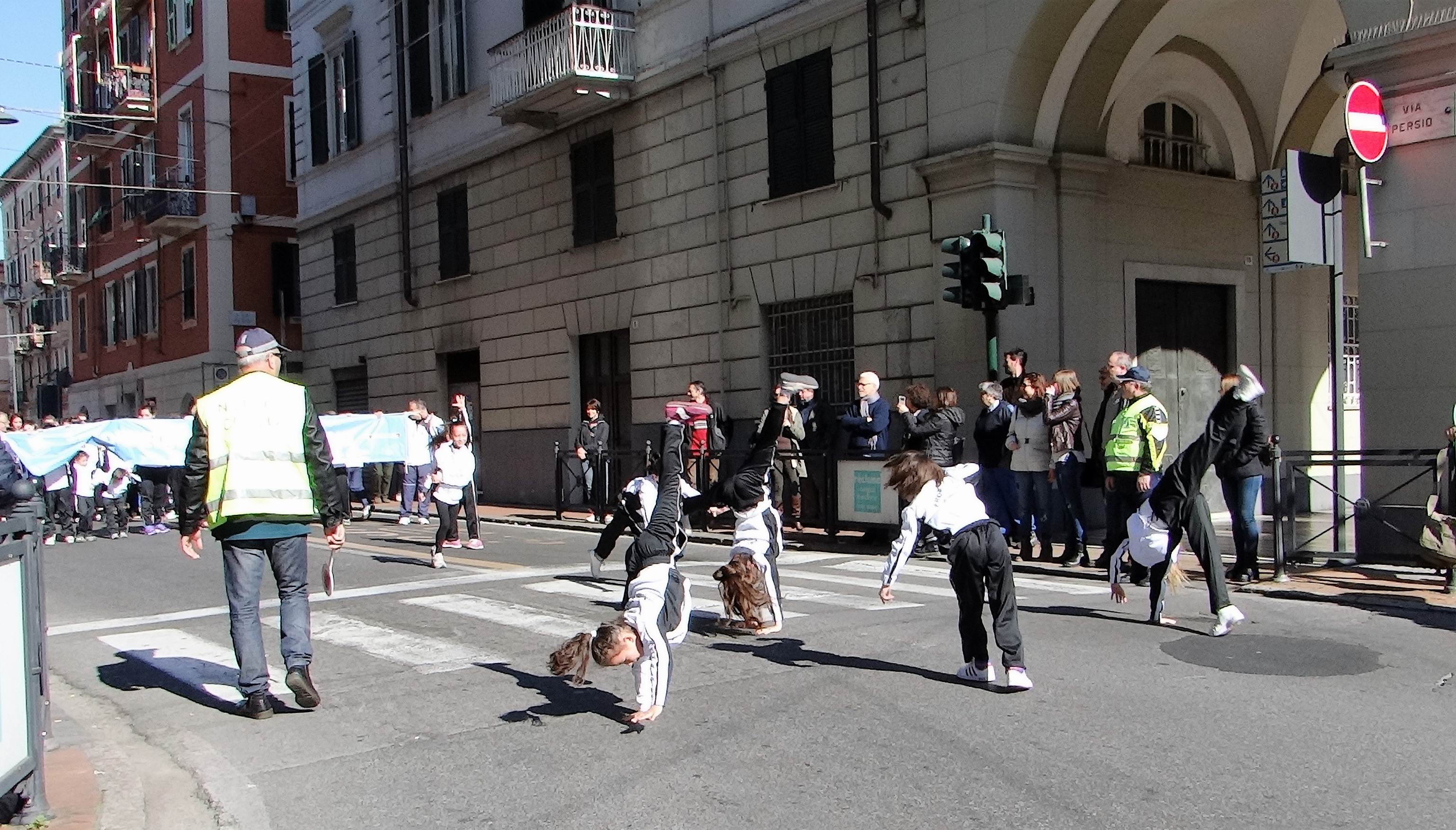 Durante le soste gli atleti giovani e meno giovani si sono esibiti in allegre capriole ed esercizi ginnici, tra l’ammirazione e gli applausi del folto pubblico che costeggiava le vie cittadine al transito del corteo, da Piazza Brin a Corso Cavour, da Via Chiodo a Piazza Chiodo fino all’ingresso Principale dell’Arsenale.