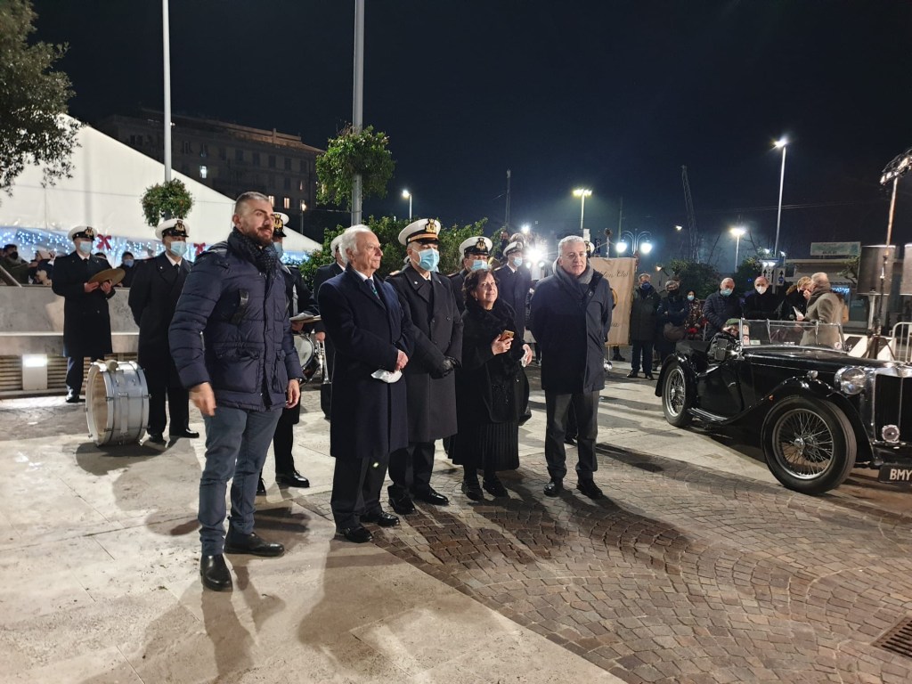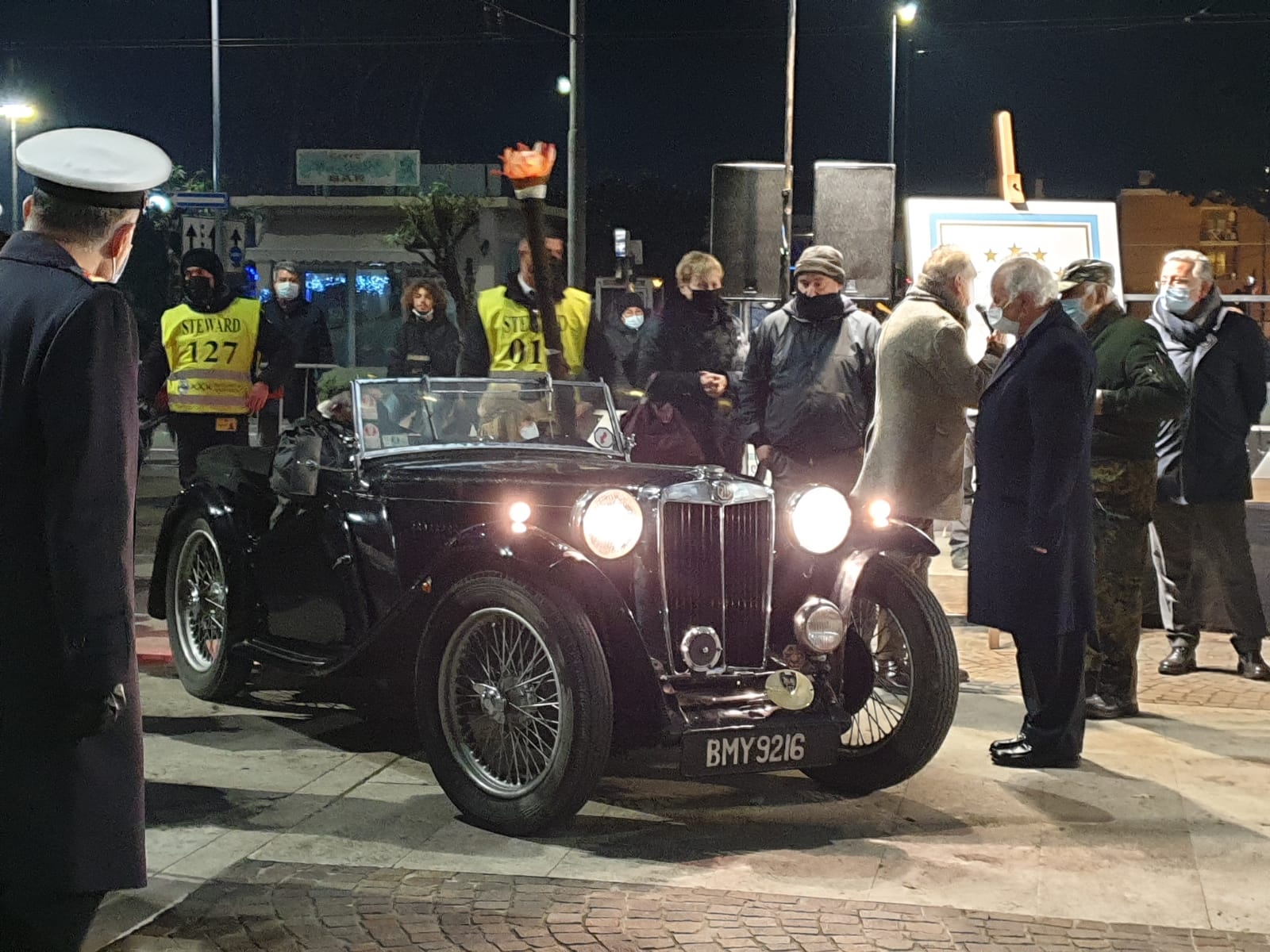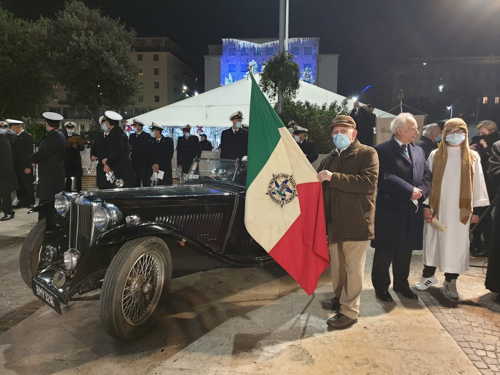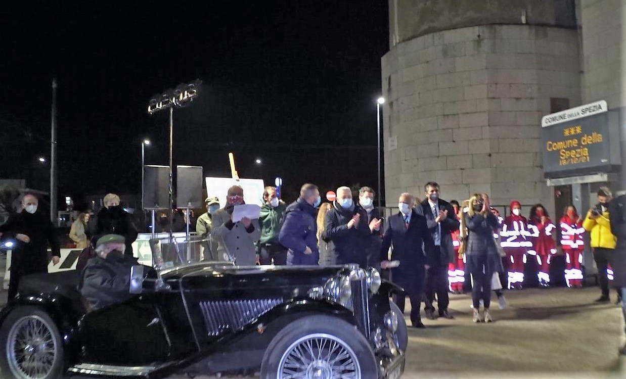 Scortata dalla Polizia Municipale la vettura storica, una Mustang condotta dal noto collezionista simpatizzante della Fondazione dott. Paolo Peirone, è giunta davanti al palazzo comunale, dov’erano in attesa la Banda di Presidio della Marina Militare diretta dal luogotenente Vito Ventre