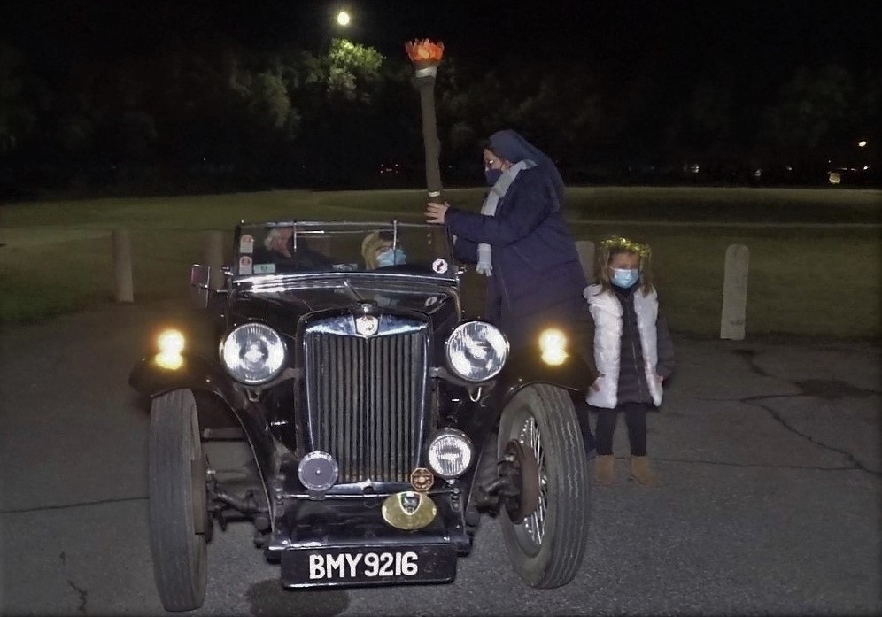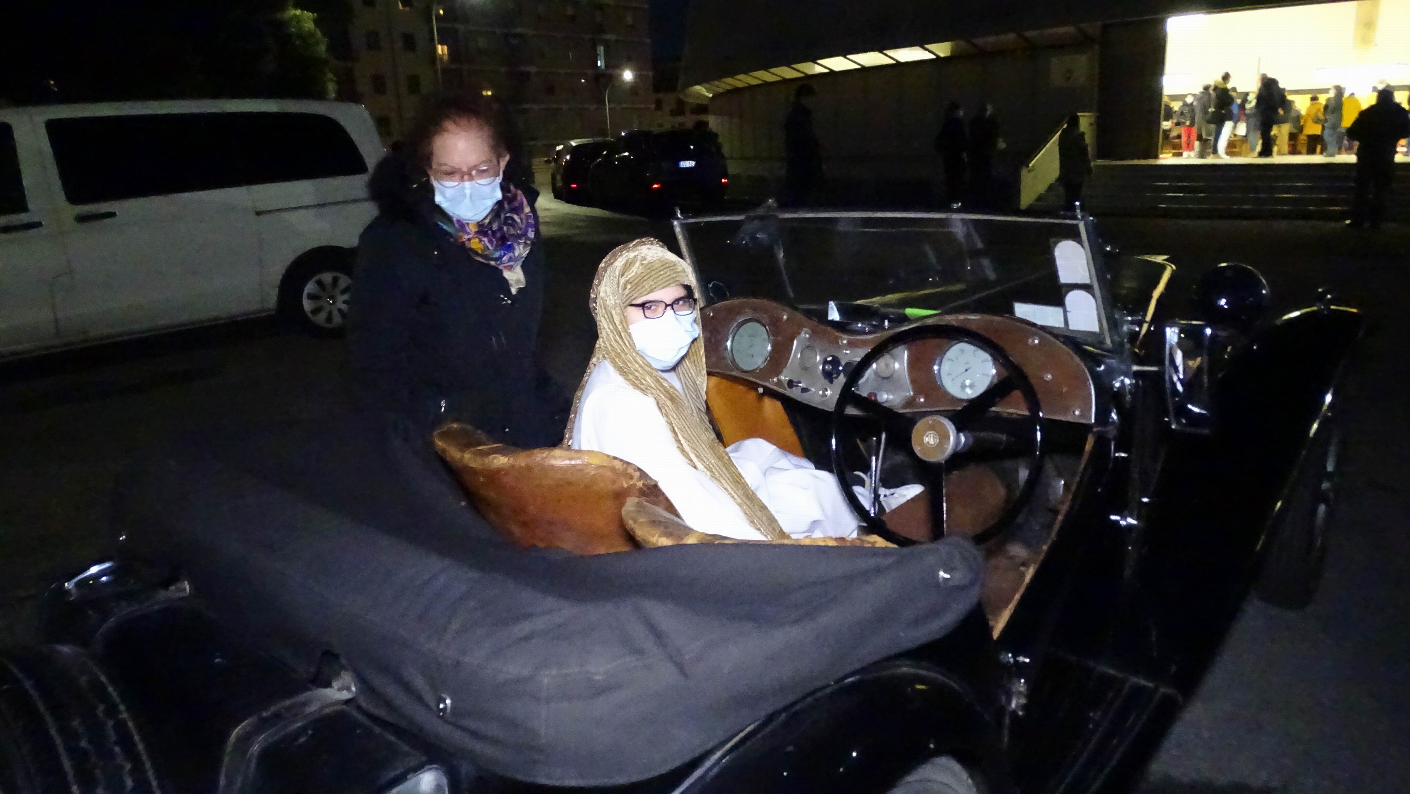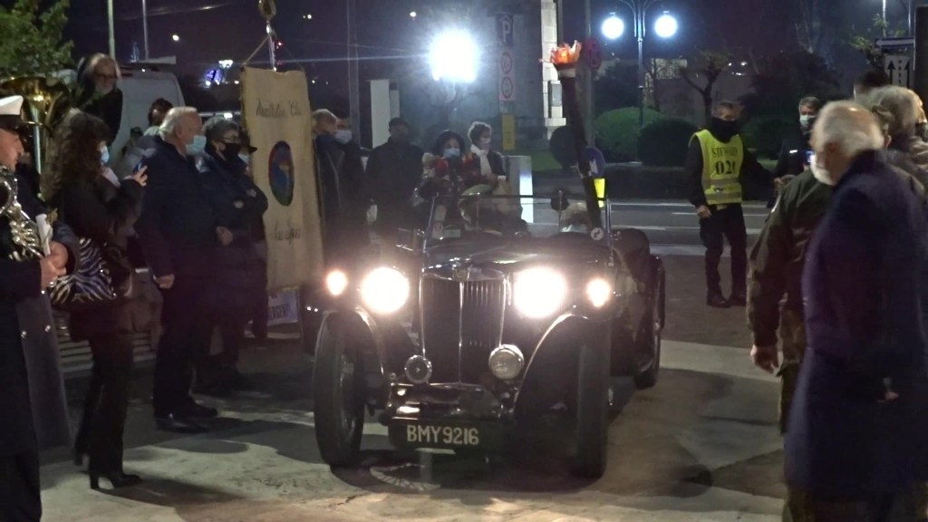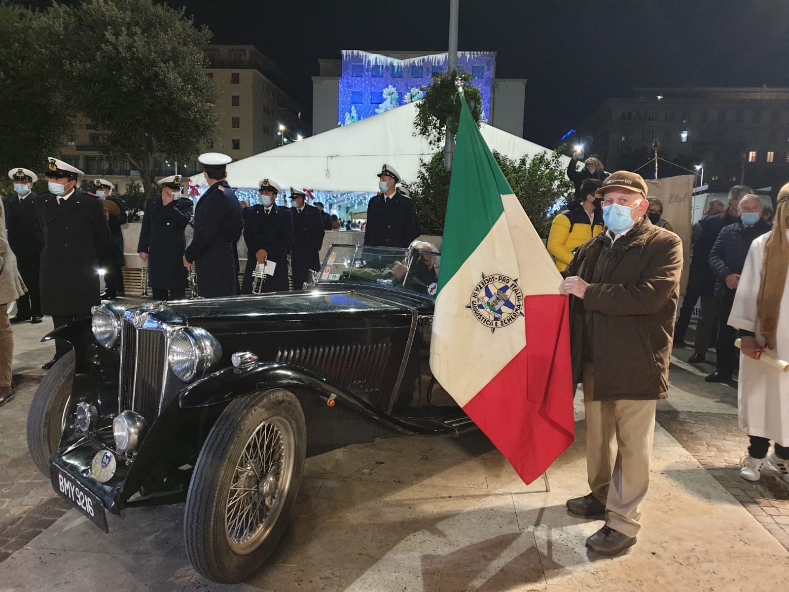 Scortata dalla Polizia Municipale la vettura storica, una Mustang condotta dal noto collezionista simpatizzante della Fondazione dott. Paolo Peirone, è giunta davanti al palazzo comunale, dov’erano in attesa la Banda di Presidio della Marina Militare diretta dal luogotenente Vito Ventre