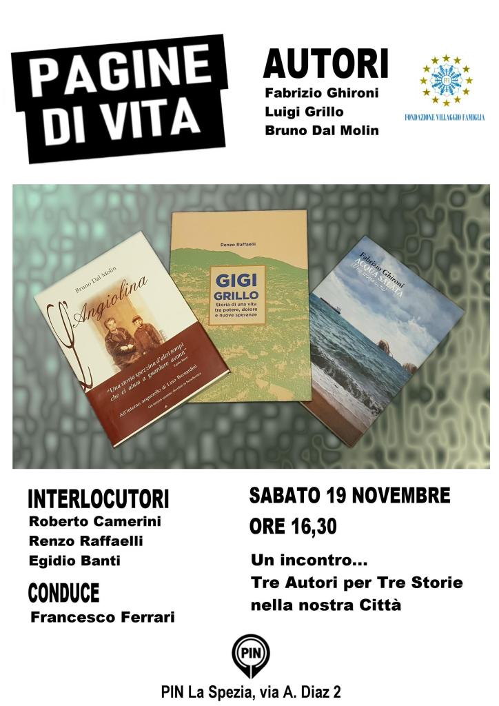 Con la conduzione di Francesco Ferrari, tre autori di libri spezzini, Fabrizo Ghironi, Luigi Grillo e Bruno Dal Molin, e tre interlocutori, Roberto Camerini, Renzo Raffaelli ed Egidio Banti, ci condurranno in un “Amarcord” di storie legate alla nostra città, che trovano spunto dai tre libri: “Acqua Salata”, “Gigi Grillo” e “L’Angiolina”.
